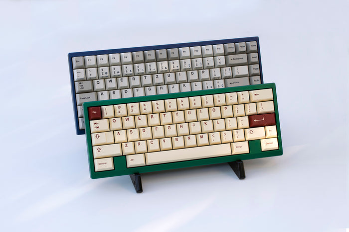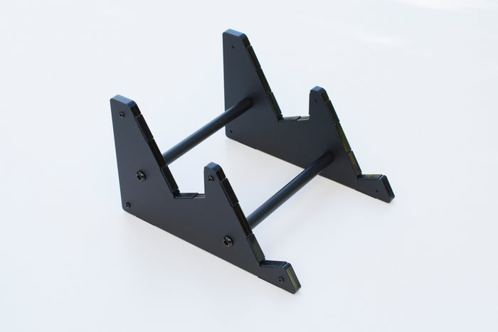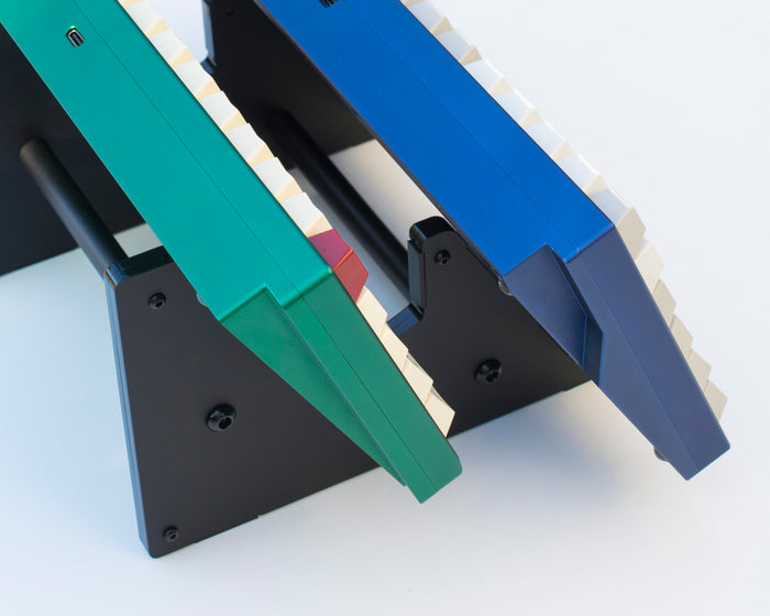 A stealthy and sturdy matte black stand that has been specifically designed to comfortably hold bespoke mechanical keyboards.